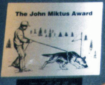 This award is given in memory of John Miktus, a member of the club from its first year. John earned seven tracking titles with his two German Shepherd dogs, Ebony and Gypsy. John and Ebony were introduced to tracking at the LTC's first match held in the fall of 1975.