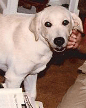 Abner fiddles around at the start, but I was determined with my picture of success that we were going to get started before the whistle blew. We did, but not by much. Our track was on a lovely field much like Balmer’s, with medium-long thick grass. The track was straight-forward with all 90° turns, little change in vegetation, and fairly flat. I thought I was going to count turns and paces, but soon forgot how many there were, so we kept going. Abner is hard to read, but I’d finally discovered that he picks his head up very slightly when he’s overshot a turn. That slight change in head position is my signal to stop and wait for him to circle and find the new direction. I kept the picture of success in my mind. We kept on going, finding the turns and getting off in the new direction. Abner walks the track and keeps a steady one-two, one-two rhythm with his tail. We kept on going straight for what seemed like a long time when Abner suddenly dropped into a Labrador-sized groundhog hole. As he hopped back out, I saw it just a few yards ahead. There it was: a large light blue leather glove just waiting for us. The picture of success. We’d done it. This was our first tracking test and our first try.