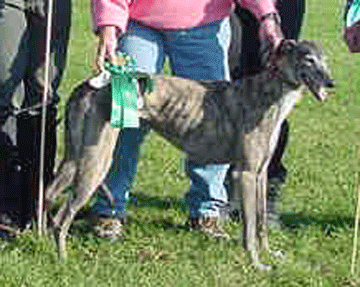 Breeze is a four year old rescued Greyhound that I have owned since May of 2005. Yes, she is a sight hound and most people think they are not good at using their nose, well this is not true. Breeze is the second Greyhound I have had, and they are wonderful tracking dogs. Shortly after Breeze came to live with me I started her tracking and she just loves it to the point of driving me crazy. When she is in the car waiting for her turn to work she barks and raises the devil until she gets her chance.