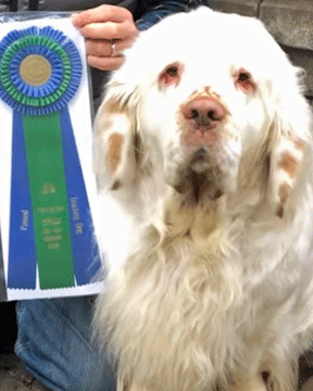 The dogs that ran tracks 1 (Australian Shepherd), 2 (Belgian Malinois) and 3 (West Highland White Terrier) all passed, so I was feeling a little pressure and mildly nervous. Cappy’s recent training had gone very well, and I was optimistic that he would do well at this test. When it was our turn to run, Cappy was in high spirits. The cool weather was perfect for him. He walked to the start article with confidence and immediately took off on the track. He was working the best he ever had, staying right on the track and not casting from side to side. He took each turn with confidence. On the final turn he overshot it, but he realized it immediately, circled back behind me, found the leg we were on and went right to the turn. This time he didn’t miss a step and then per his way of indicating the end article, he picked up the glove and showed it to me. Our finish time was just over 5 minutes. We were both very happy and Cappy was pleased with himself as he carried the glove back to the judges. Both judges gave high compliments on a well-run track. Jill was so pleased Cappy did well after his less-than-stellar performance at the Lenape TD test, or, as some would say, Cappy exhibiting typical Clumber behavior. He will now be registered as CH Nexus Roundhay Captains Courageous, TD.